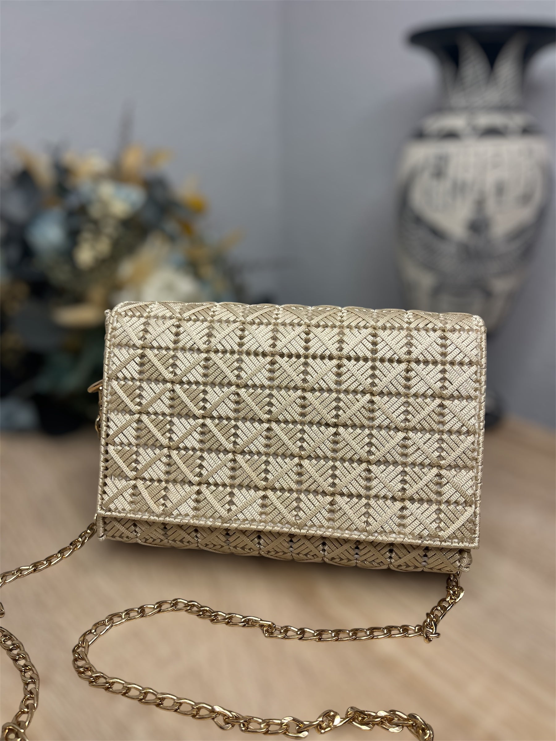 Este bolso hecho a mano rinde homenaje a Isis, la diosa egipcia de la feminidad y la protección. Su textura geométrica tejida refleja la perfección de los símbolos ancestrales, mientras que la cadena dorada aporta un toque de sofisticación y poder, evocando la realeza del antiguo Egipto.